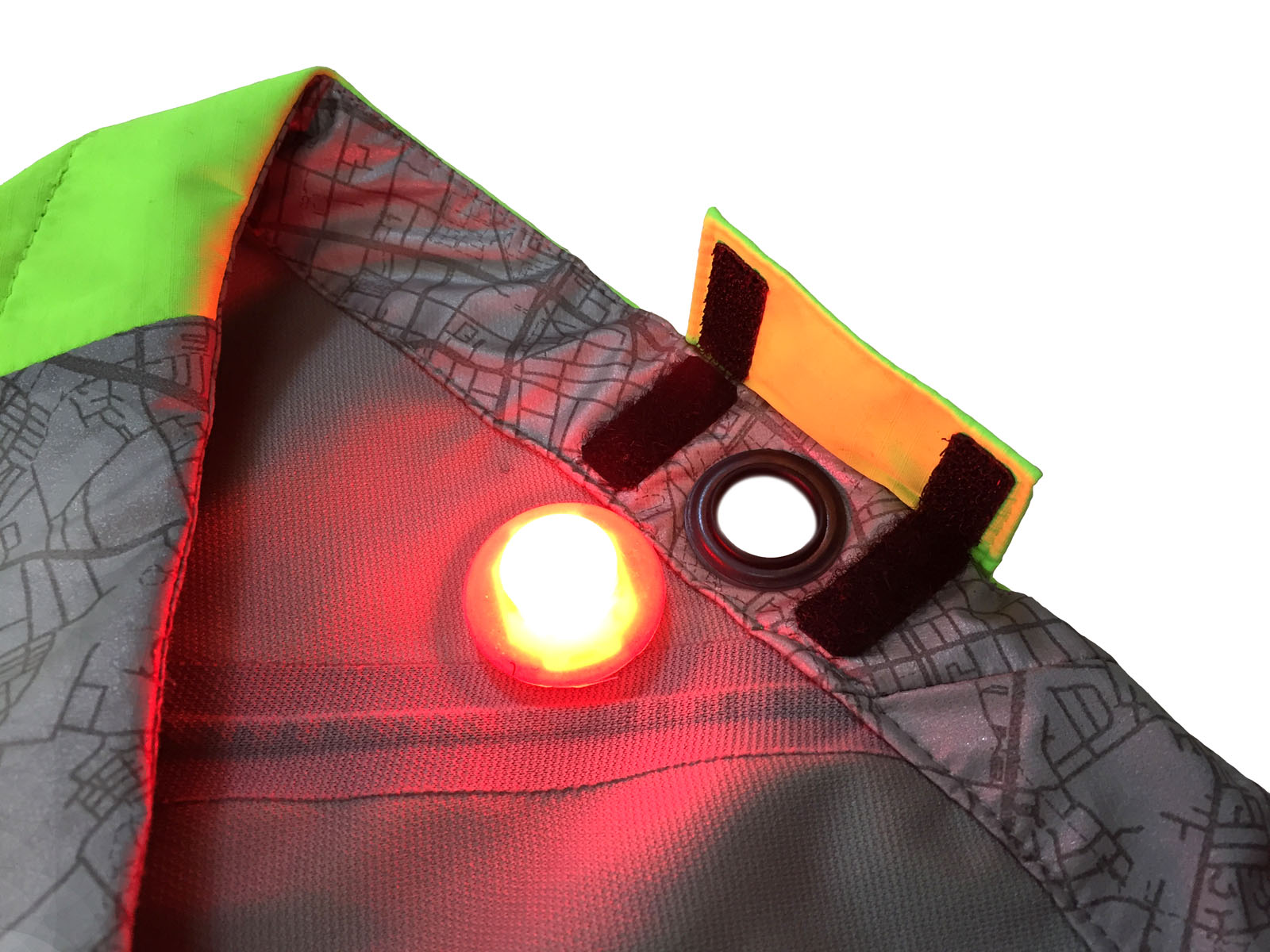 - Integrated LED flashing Lights. Yes! lights that come with and clip into the jacket. The blinkeys are removable and positioned in key areas at the wrist cuff and lower rear hem for the ost visibility. These can be removed for jacket washing or replacement of led batteries and are secured in grommets in small velcro pockets.