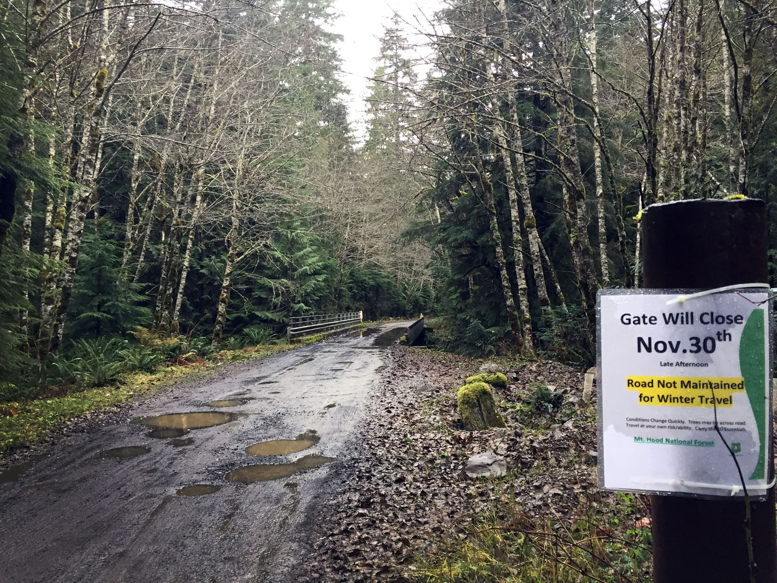 Starting at ZigZag Ranger station, park up and ride out of the back of the car park, where you will find a small trail, this helps avoid Hwy 26 going to Still Creek Rd. The first part of the route is mainly Still Creek rd to Trillium Lake, mainly unpaved, light gravel with a few sections of deeper but manageable gravel (see pics below) and if the snowline is too low on the day you ride you can turn around wherever you like (highest point near Trillium is 3700ft ). This road is rarely travelled and makes for an enjoyable almost car free ride. Off to the sides of the road are beautiful small creeks flowing into Still creek while immersed in that quiet wintery vibe nature.