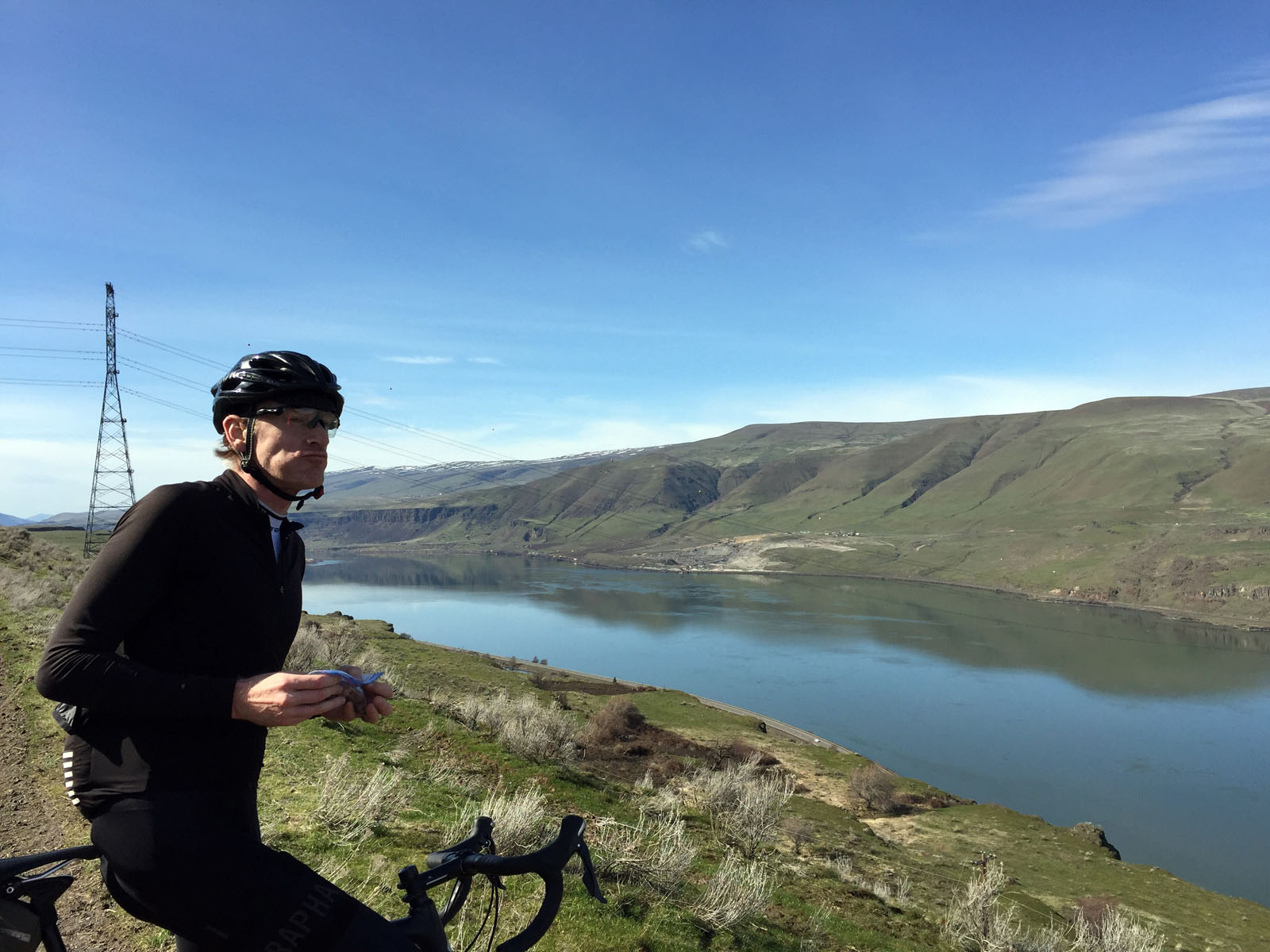 Meeting at Holsteins coffee in The Dalles (yeah this place is the only city where “The” is a formality in its name) After crossing the bridge to the Washington side (2023 Bridge is under construction down to alternating one lane during week days) , the route kicks in with a brisk (by that a mean big bugger) climb up Dalles Mountain Road. This road is actually the entrance to a state park – Dalles Mountain Ranch is part of Columbia Hills State Park, there are quite a few hikes in there but that’s for someone else to blog about. The climb is all gravel and rocky in points, goes on for about 9 miles and up 2000ft. At points the grade is steep, but the outlook across the water to the Oregon side is beautiful with some wicked views of Mt.Hood on a clear day. (this day was dishwater clear)