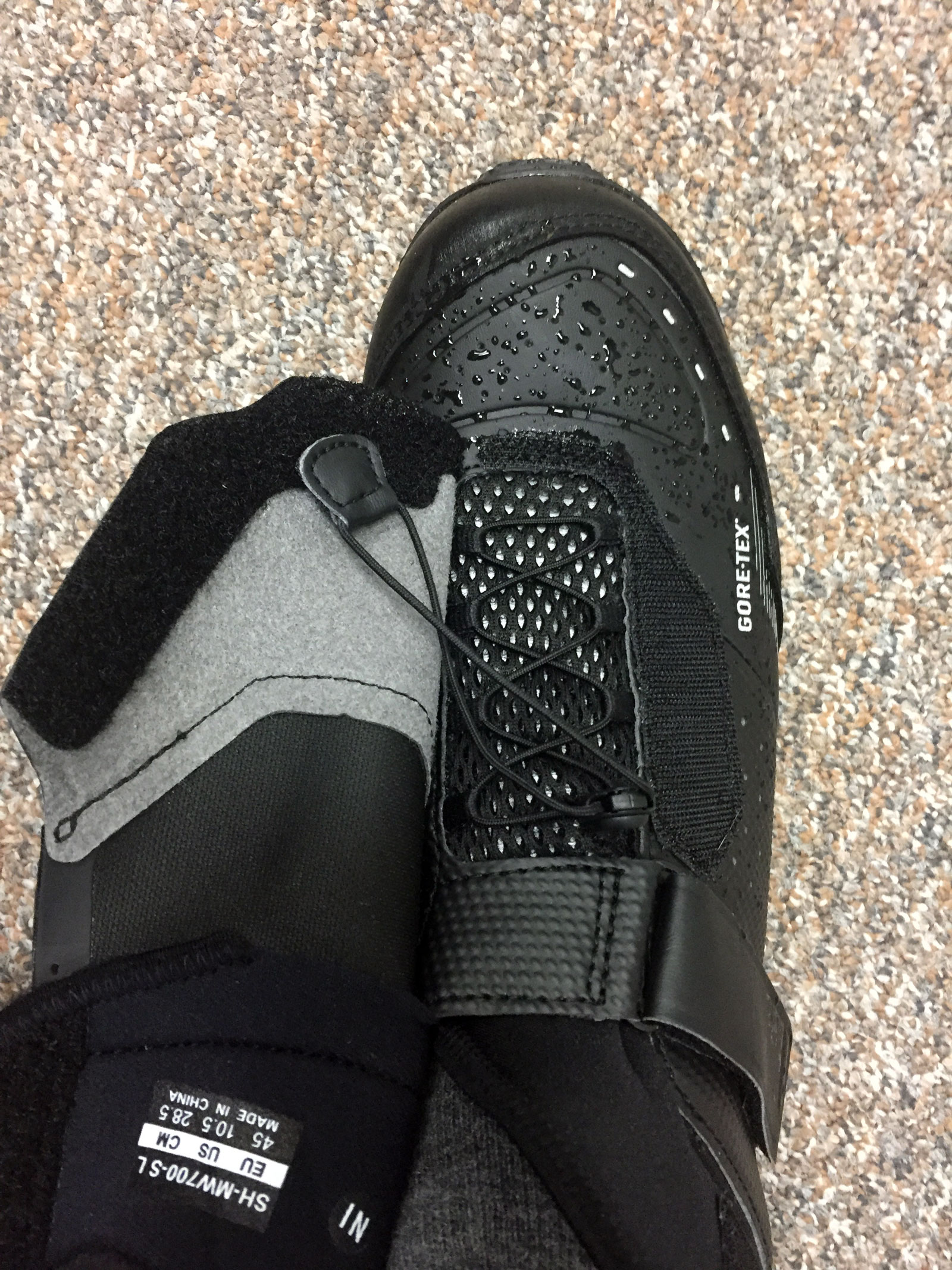 With a Gore-Tex upper and the amount of boot like robust materials and pvc flaps you may feel like this is invincible, and it is to some things. But not the rain, don’t expect it to be totally waterproof on longer rides. I rate the waterproofness of this shoe as on par with the best shoe covers. Part of the reason why waterproofness is not higher is due to the cuff. The cuff (which you can see as a different looking material) could be a little higher and made from a material that doesn’t retain / wick moisture. This might be something Shimano should consider modifying if they wish to attract more all-weather commuters.
