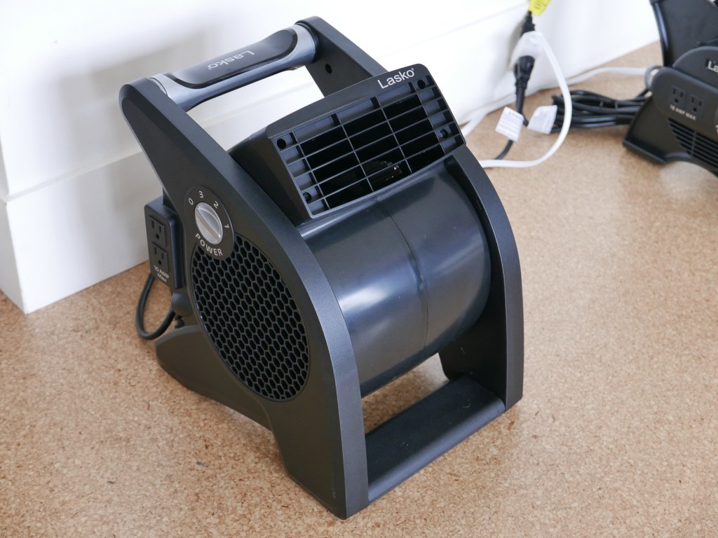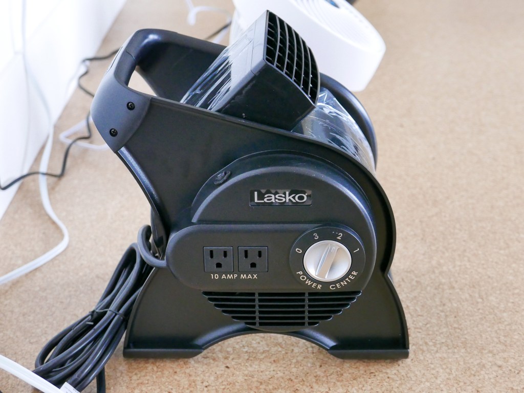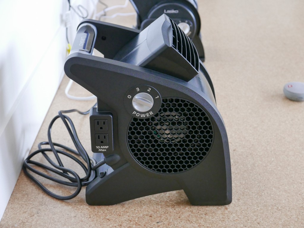 This unit is a little bit bigger than the prior fans. It is a little bit taller and wider, but in my mind still classes as small and sits on the floor. It also has 3 speeds and an adjustable angle air nozzle. This model also has a circuit breaker and two electrical outlets on the side of the unit.