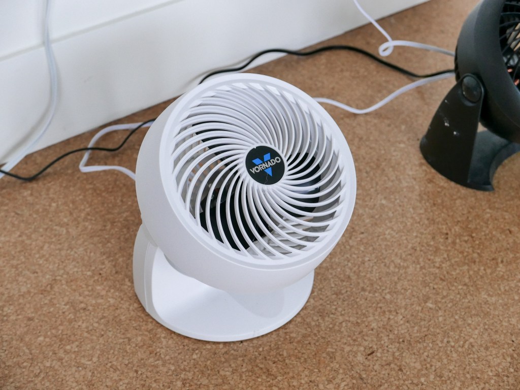 The second fan was a 12″ Vornado fan with promise of higher air flow using Vortex air circulation (?) but still having the advantage of being a small size and directed easily. This has 3 speeds the same as the Honeywell. This was around $50.