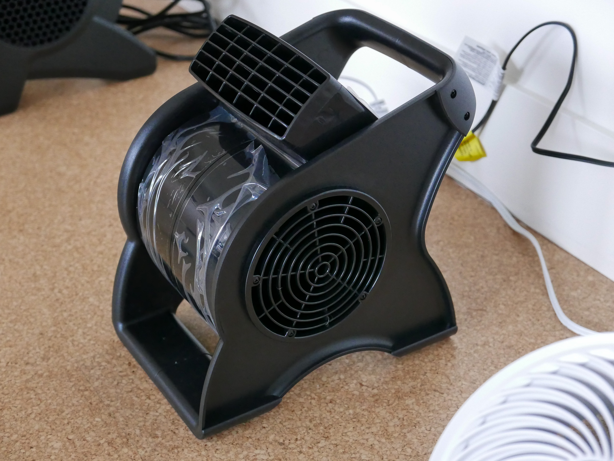 The third fan was technically more of a blower, i.e. a cylindrical cage that rotates horizontally and pushes are out perpendicular to the orientation of the motor. This is more of a style which industrial fans or flood equipment use. In theory this provides a better noise to to air volume, as they can have a large blower cage that produces a lower noise when compared to an axial fan.