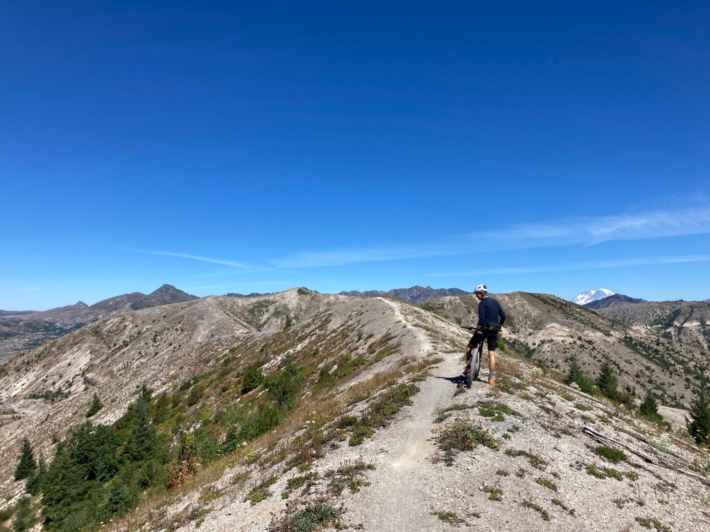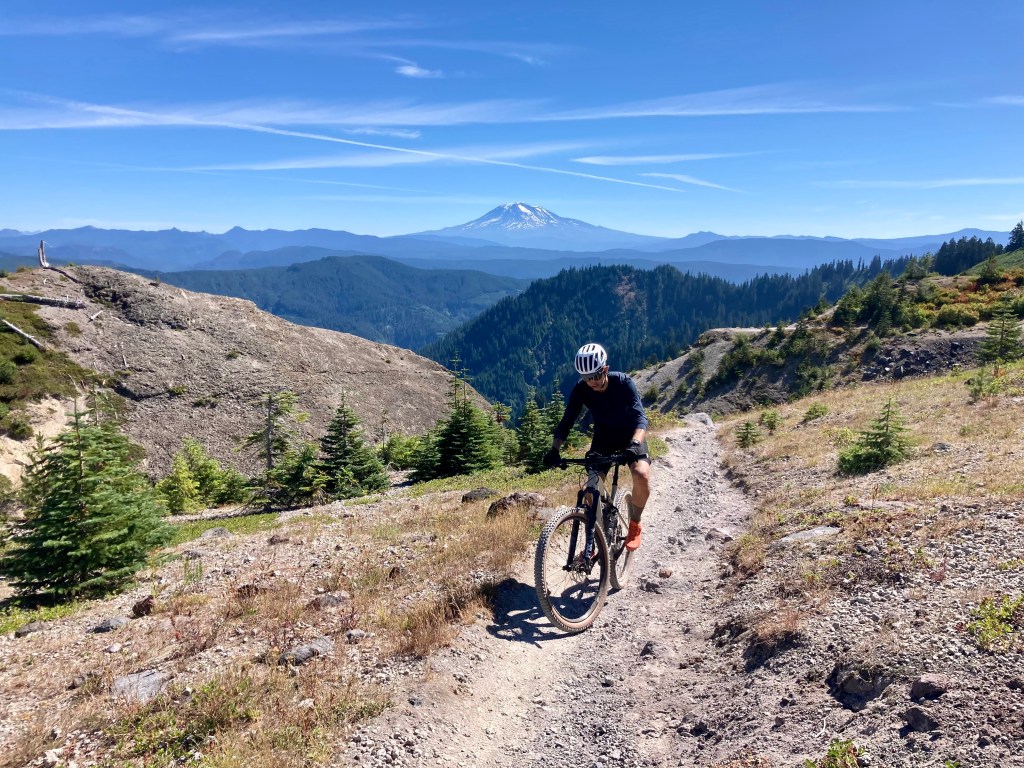 Ape Canyon, the first part is a single track climb that is mainly in the trees, it goes up 1600ft over 4miles, never gets super steep, but constantly peddling up on a generally smooth well defined wooded trail. there are several points where you have great views both at the mountain and East into the valley. When you get to the top you immediately know as it opens into some mind blowing views. This trail continues and winds around some rocks with small sections of up for another 4 miles. The terrain up here is small lava rock which is loose and in general ridable as it feels gravel esq. There are a few sections towards the end of the Ape canyon Trail where you will find small boulders of lava rocks, for the most part the trail weaves through these but there are small areas where you have to be good at riding rock patches or walk your bike. Not a big deal, just good to mention.