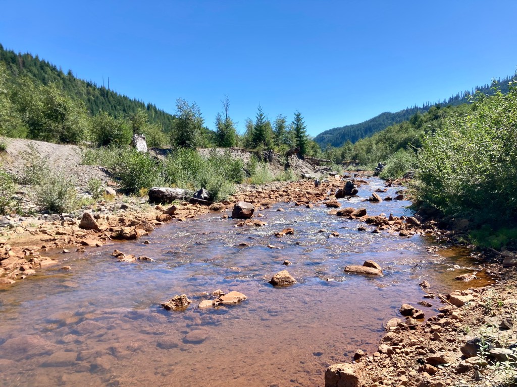 Lower down you drop into a more forested vibe, a fun section of semi flowy dips and bumps to have fun on, then a meandering trail alongside the creek, its very pretty as the birch trees overhang the sides. Some sections are on old river bed which is quite sandy and some push a bike is needed. You will need to cross the creek a few times down here and if you are careful you can do this without getting your feet wet, but for the most part expect to get some water in your boots, which is alight on a nice warm summer day. Smith Creek is a source of filterable waters, but note that this is close to the end of the ride.