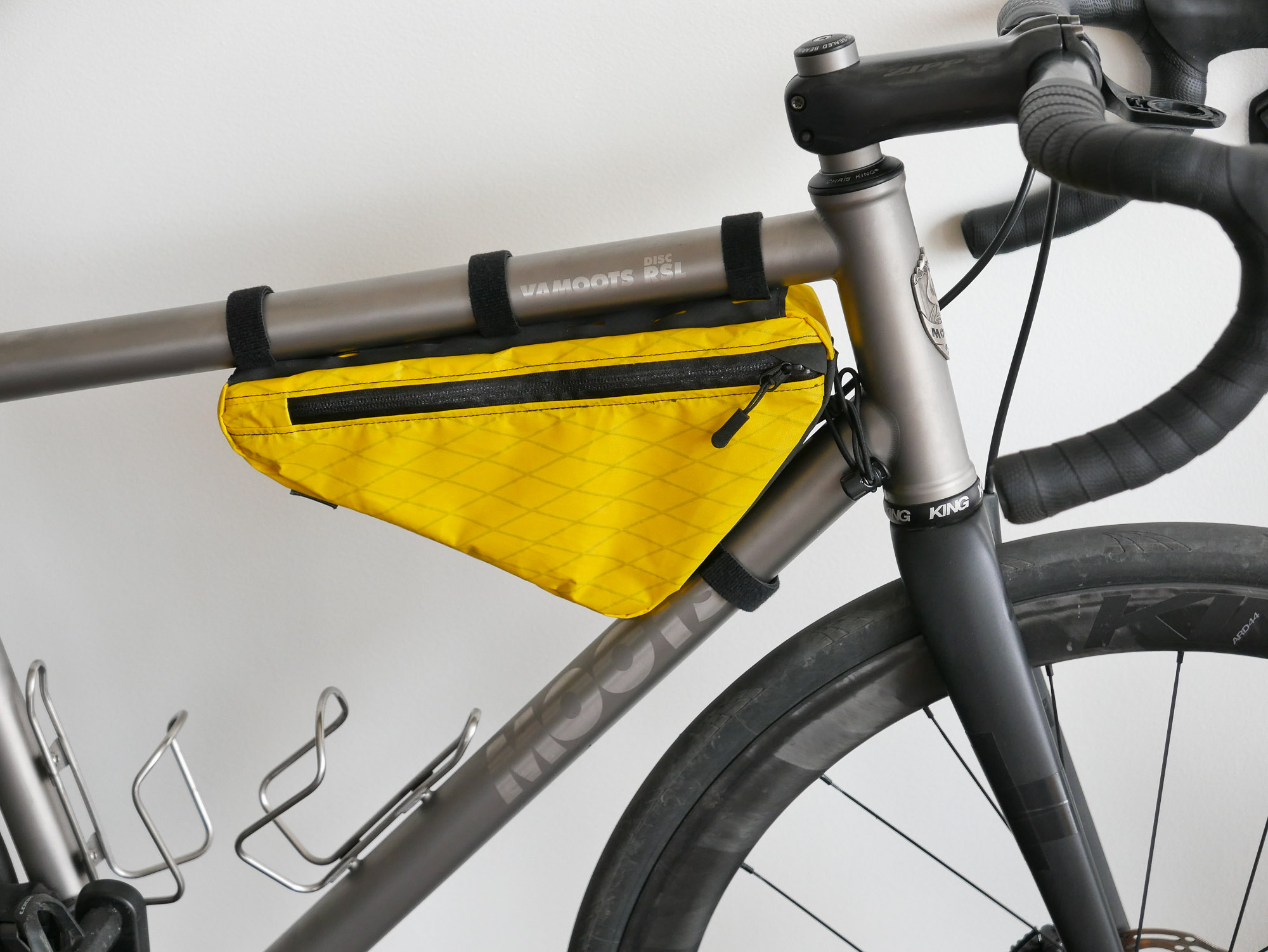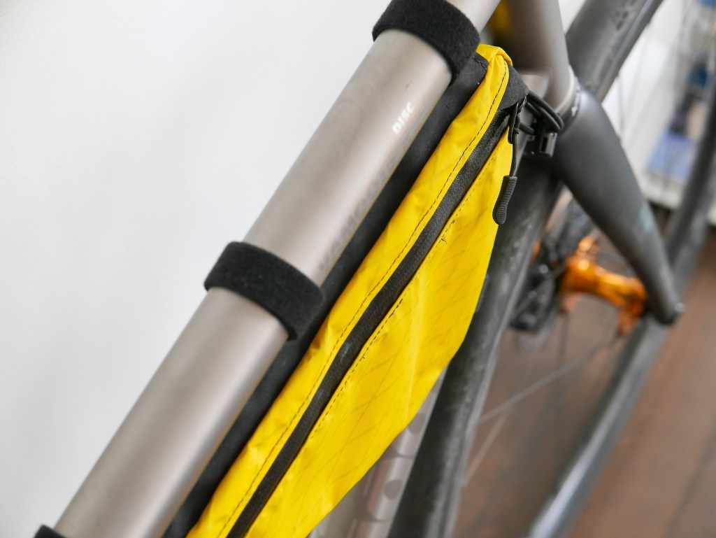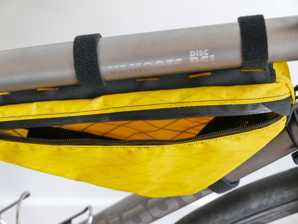 The loaded bag fits securely thanks to well-designed straps, but check out the dimensions before purchasing. For the fast adventurers, it’s barely the width of the headtube. It doesn’t interfere with your pedal stroke, and it’s also very aerodynamic.