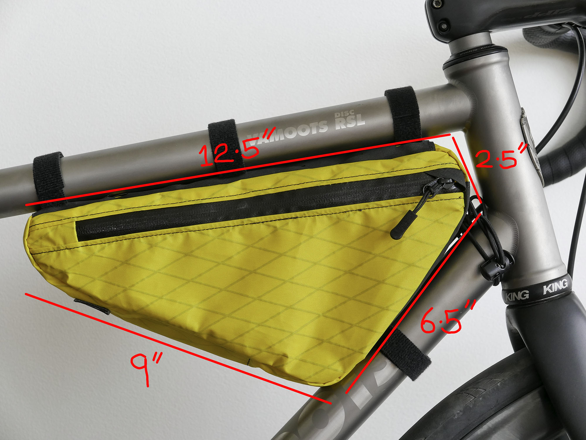 The Slice framebag has a volume of 96 cubic inches and weighs 129 grams. As for its dimensions, you can refer to this image for a visual representation: Slice Framebag Dimensions