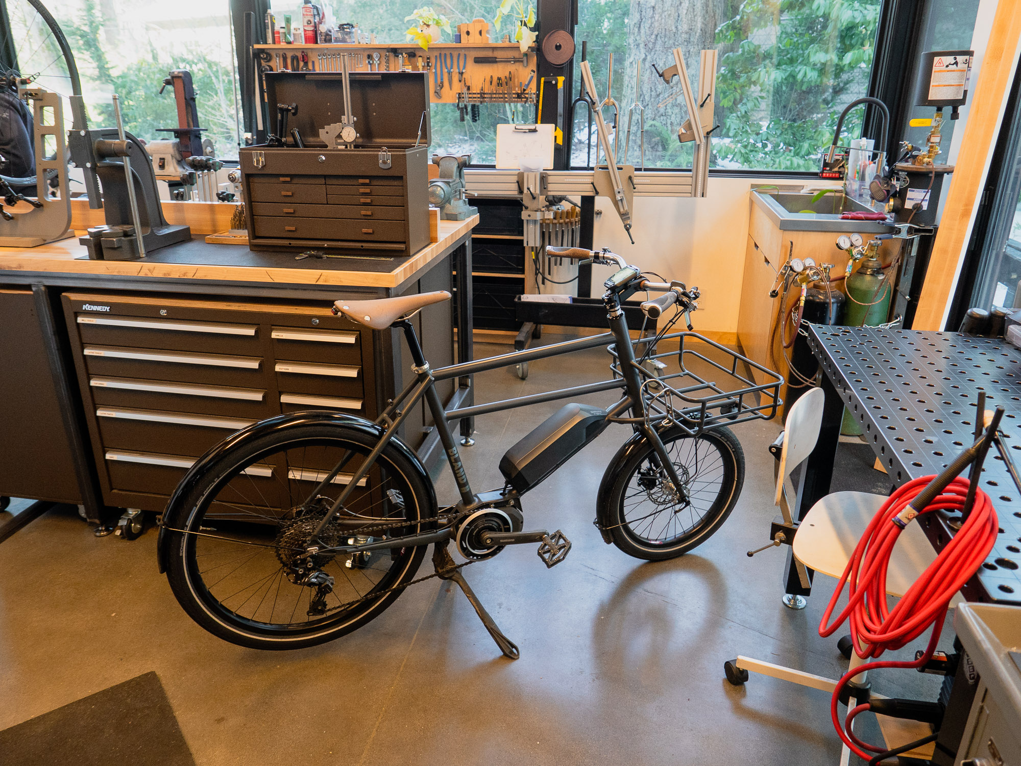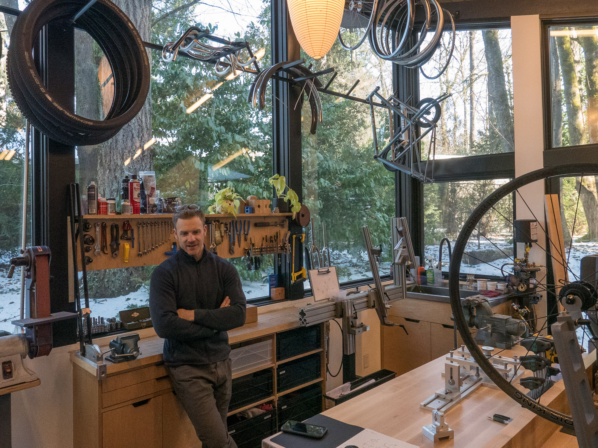 Tucked away in the back roads of Lake Oswego, Oregon, Chris Blandford of Blandford Bicycles hosts his workshop and machining lab in Dwell magazine style surroundings. Chris tells others that he owes his creativity and innovative spirit to his grandfather (that’s his welding mask on the bookshelf). He explains that his grandfather impressively designed and then successfully mass manufactured several items of commercial machinery, which serves as a source of inspiration for him.
