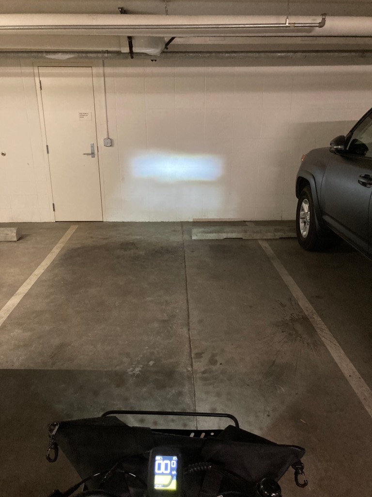 The front light is really good. The pattern, brightness, beam width, and height are great. Here are a couple of pictures taken about one car length away from a wall. At that distance, the main focal point is similar in height to a car’s headlights. I haven’t measured the light output, but based on my experience, it’s probably around 550-650 lumens. This power output seems very appropriate for city riding. If you were in a rural area with no street lighting, a power of 800-1200 would be better. The current light could easily be augmented with a handlebar light.