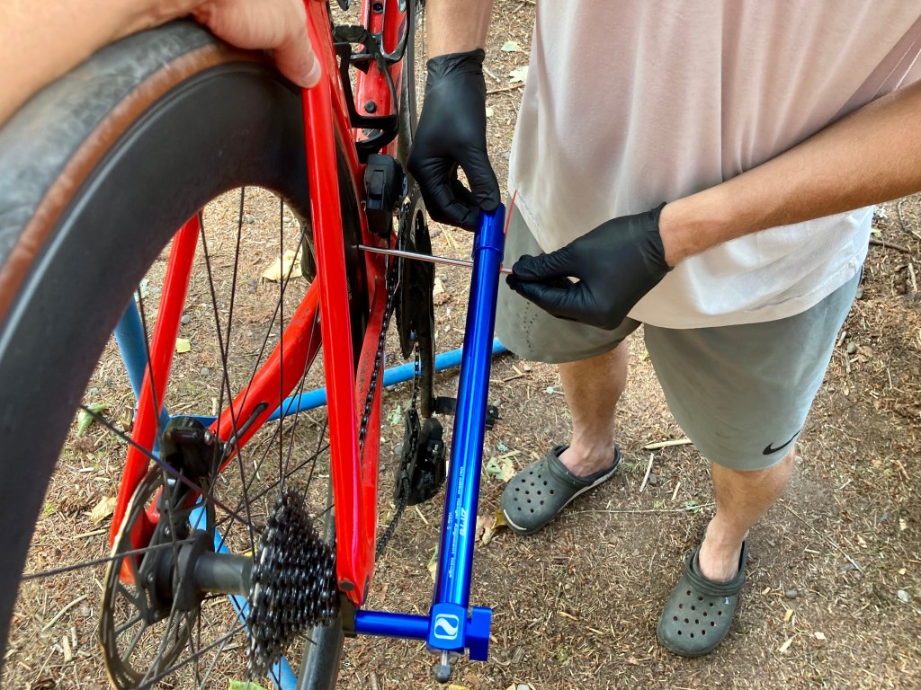 - Screw in the ZTTO tool to the derailleur hanger.Becarefull not to strip the treads and use a little grease.