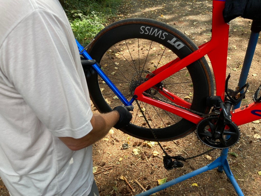 - Put your bike in a stand, or upside down might work in a pinch. You will need the ability to rotate the rear wheel.