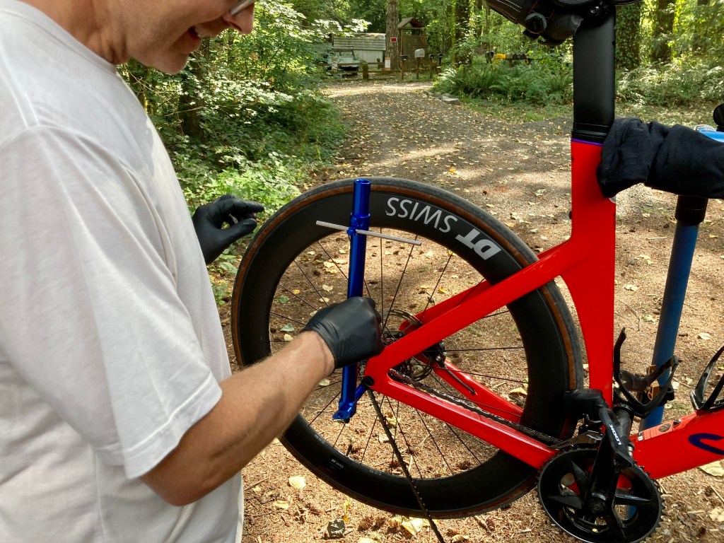 - When measuring alignment at 3 and 9’oclock you swing the main arm from 9 to 3 position, passing the frame’s seat stay which means you have to retract and move the Calibration Gauge. You can see in picture 2 (above), as soon as you loosen the screw, the Collar can rotate on the tube. Providing some inaccuracy if not super careful.