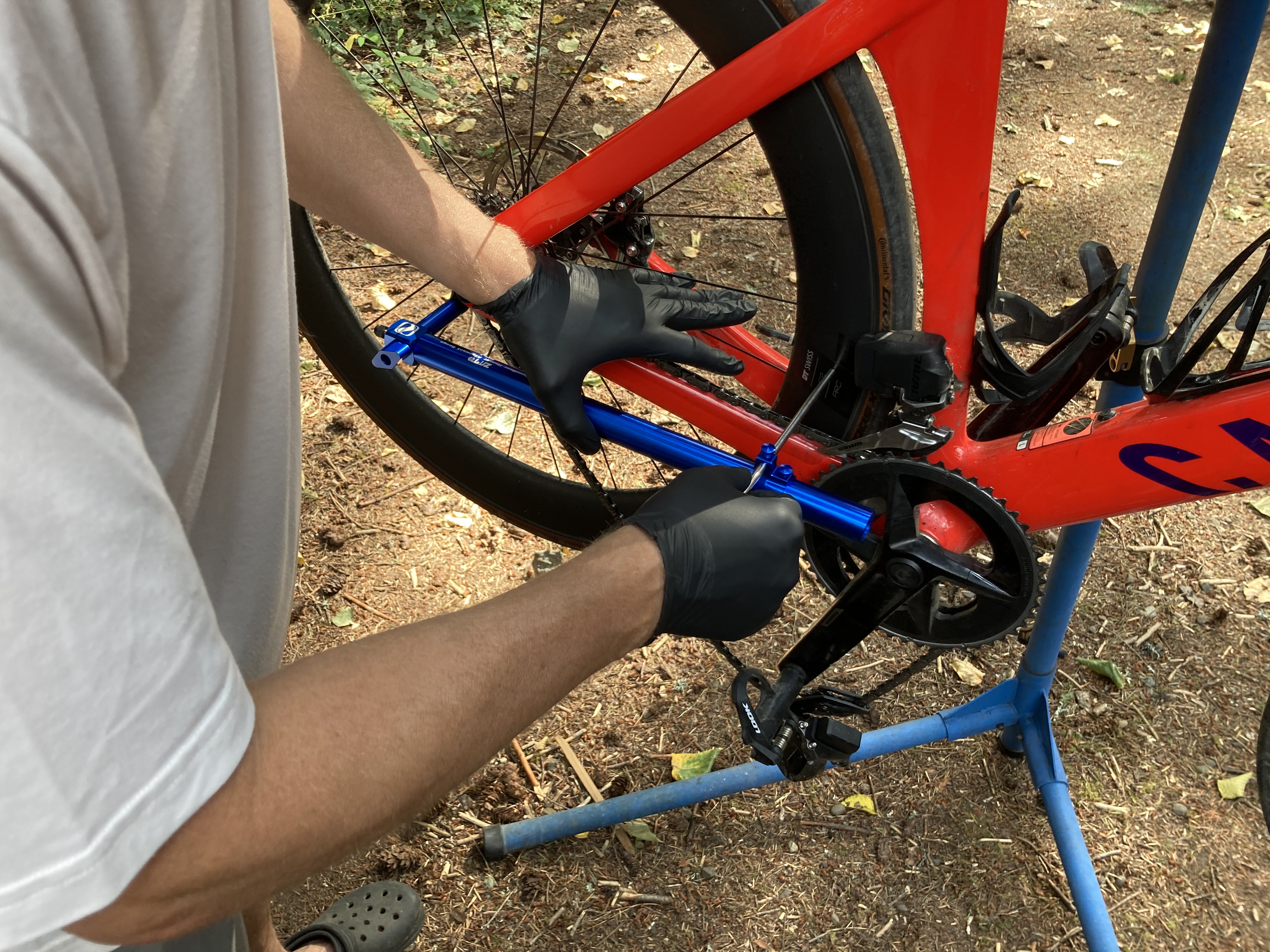 - Screw in the ZTTO tool to the derailleur hanger.Becarefull not to strip the treads and use a little grease.