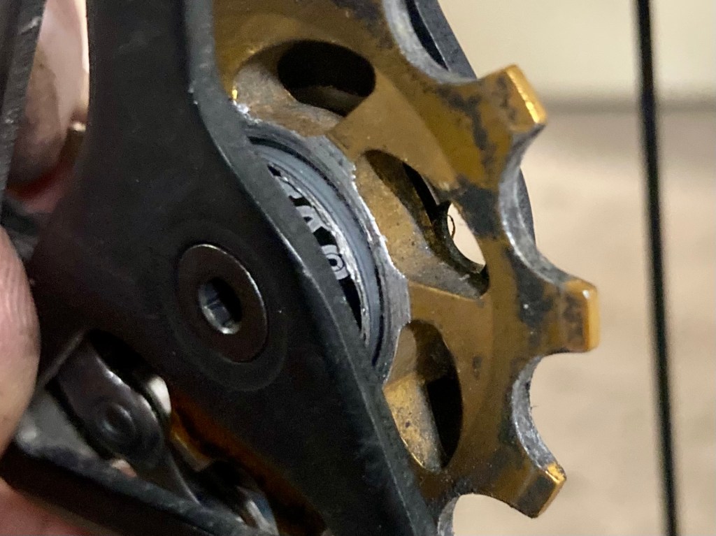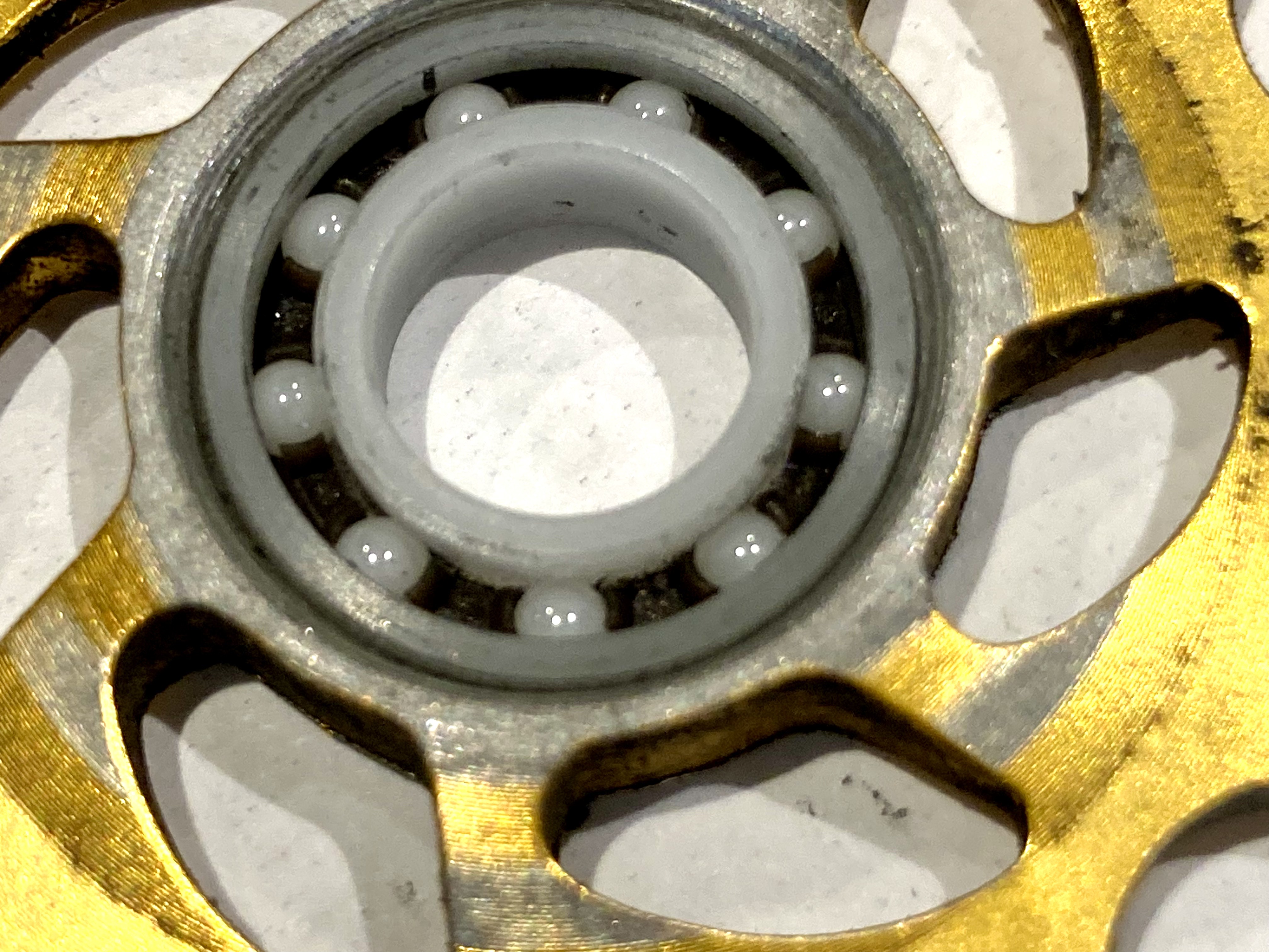 - Picture 5 shows the bearing. it’s a plastic material but what is not show here is the level of slop causing a lateral movement of the cog. The lateral movement of the cog I measured at 3.1mm at the tooth , a 12spd shimano chain distance between inner plates of inner link is 2.2mm!, so you can understand that when the bearing is this bad, it could easily drop the chain from mis-alignment.